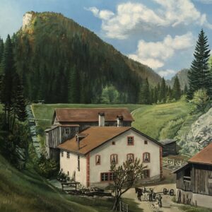 Légende peinture : Maison à Bollement, lieu-dit de la commune de St-Brais, canton du Jura. Toile réalisée en 1989 par Pierre Farine de Montfaucon, des années aprÚs la destruction du lieu.